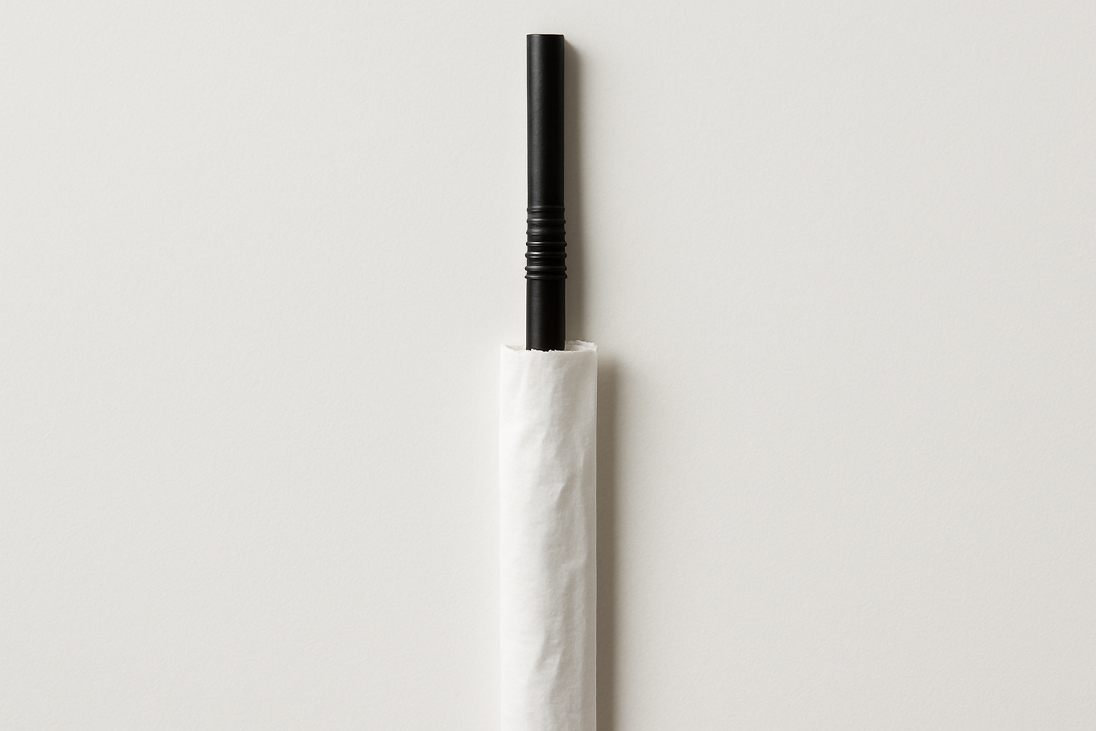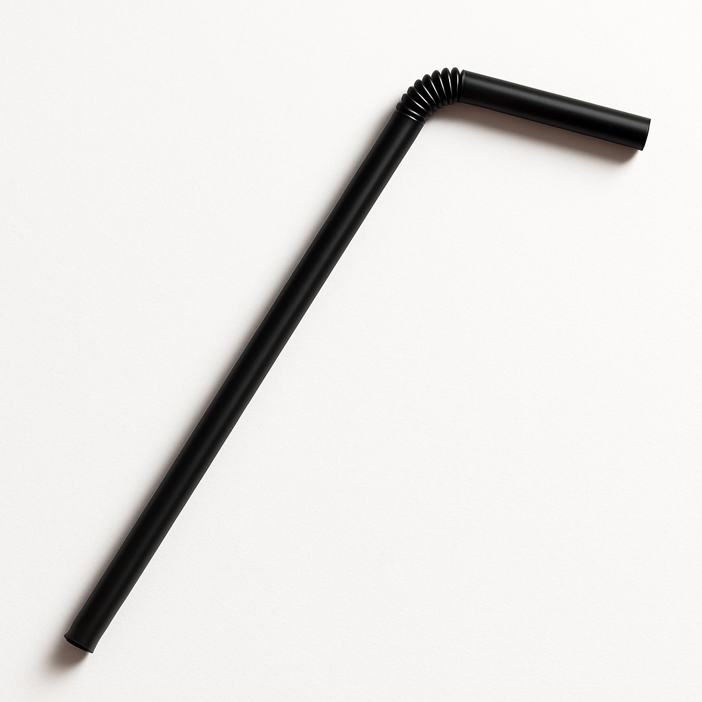 a 7.75" long black straw with a 0.5" flexible neck, in a paper wrapper that has been pushed halfway down the straw to expose 30% of the straw